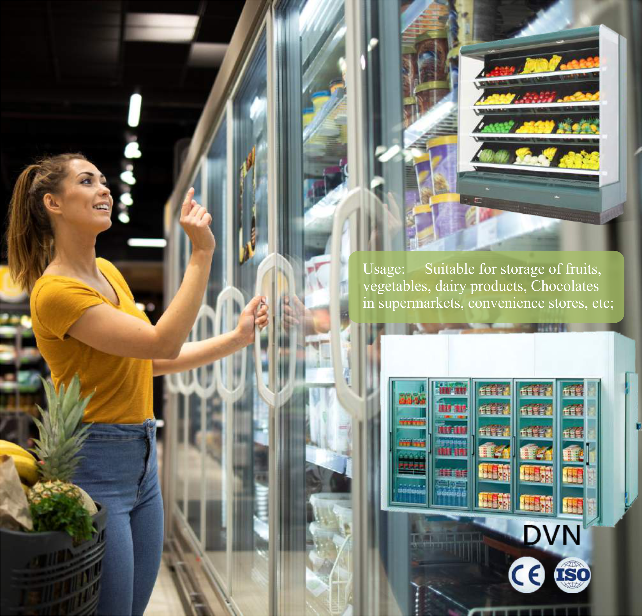 Good display effect and large internal refrigerating space, especially for downtown shops without back warehouse and difficult to replenish the goods